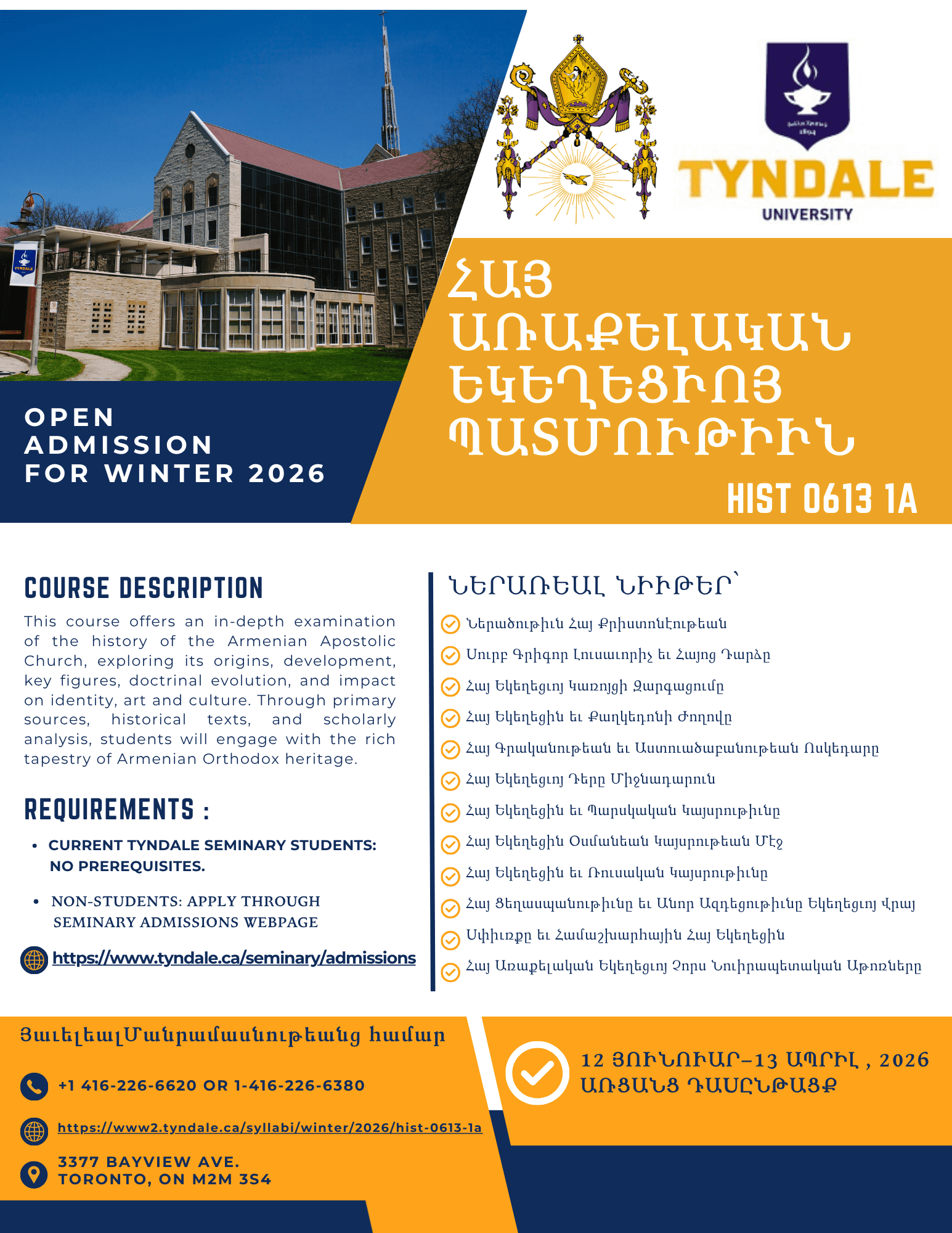 Armenian Prelacy of Canada announces the launch of Armenian Theological Studies Program at Tyndale University, in Toronto